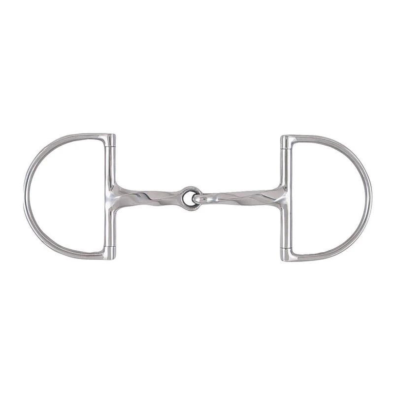 The Korsteel Stainless Steel Slow Twist Hunter Dee Ring Snaffle Bit compromises between an eggbutt and a full cheek snaffle, preventing pinching at the corners of the mouth and without the dangers posed by the arms of a full cheek snaffle.