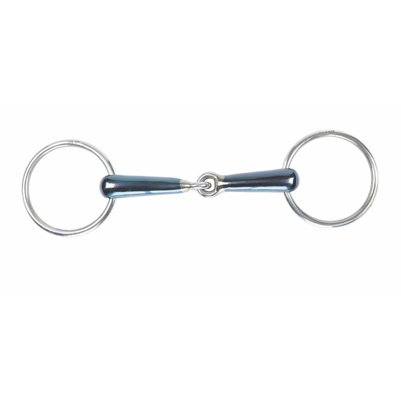 The Shires Blue Sweet Iron Hollow Jointed Loose Ring Bit discourages the horse from fixing its mouth on the bit.
