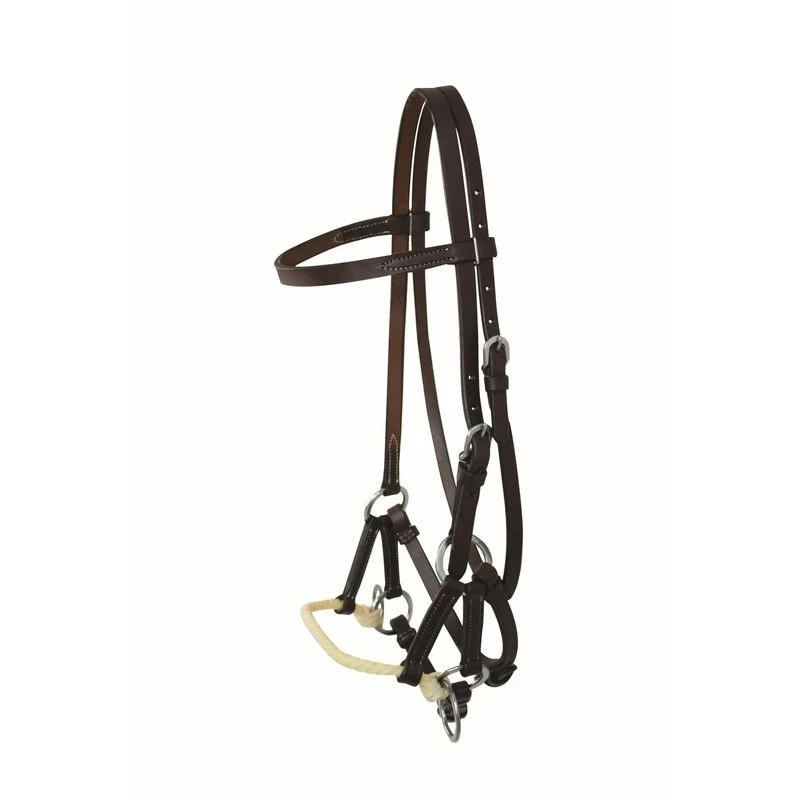 For the perfect start, the Western Rawhide by Jim Taylor Side pull is your go-to gear for your young or restarted horse. This oiled leather headstall features one rawhide rope noseband and double curb straps.